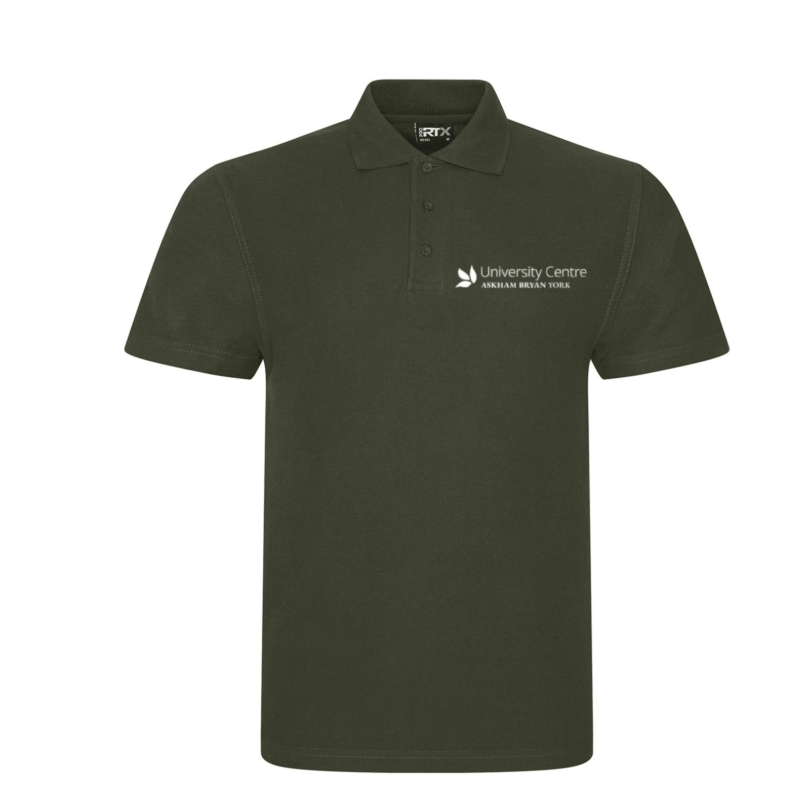 Stay comfortable with our exclusive University Centre Askham Bryan khaki green polo shirt.